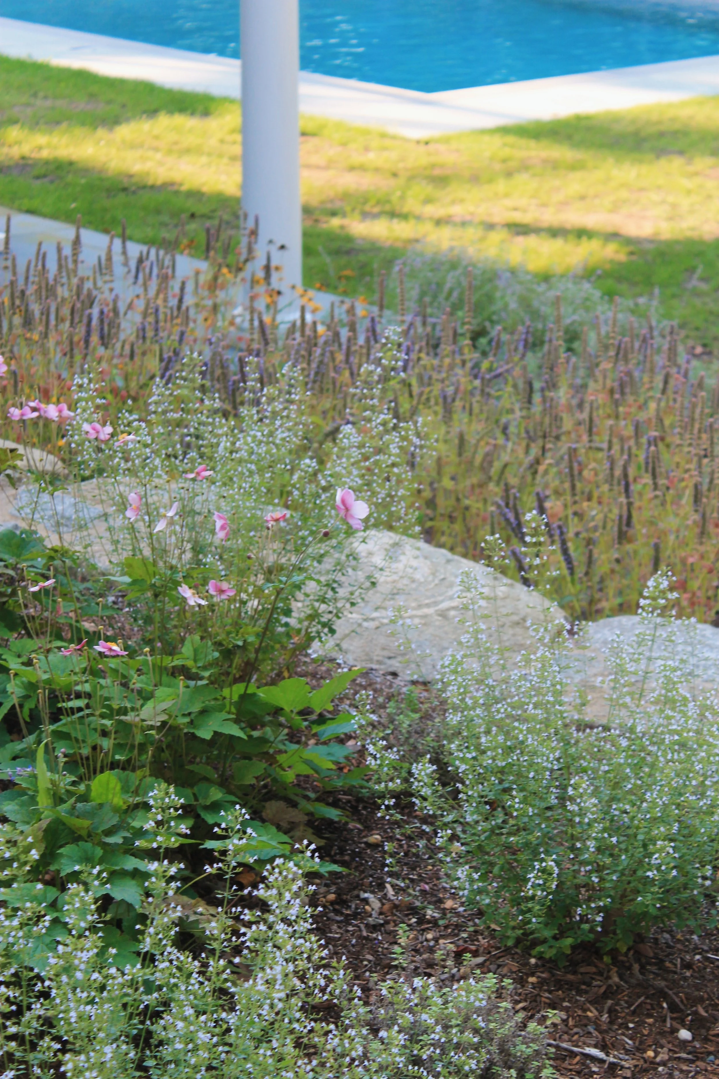 Built around a foundation of substantial hardscaping, this design features custom granite steps and extensive stone retaining walls that provide both structure and timeless character to the landscape. The planting plan utilizes a sophisticated palette of perennials and grasses to create soft, naturalistic layers that harmonize with the rustic masonry. By selecting species with four-season interest - from vibrant summer blooms to the architectural textures of the winter season - the gardens maintain a compelling visual presence year-round. This careful orchestration of stone and flora results in a balanced landscape where the rugged, permeant quality of the hardscape is softened by airy, seasonal drifts of vegetation.